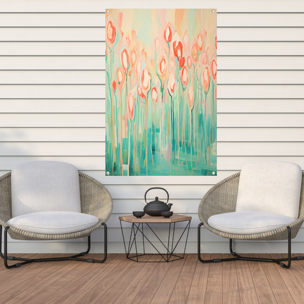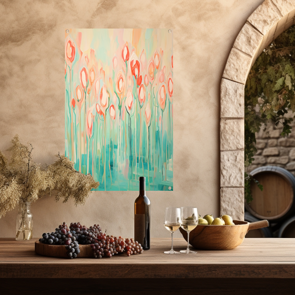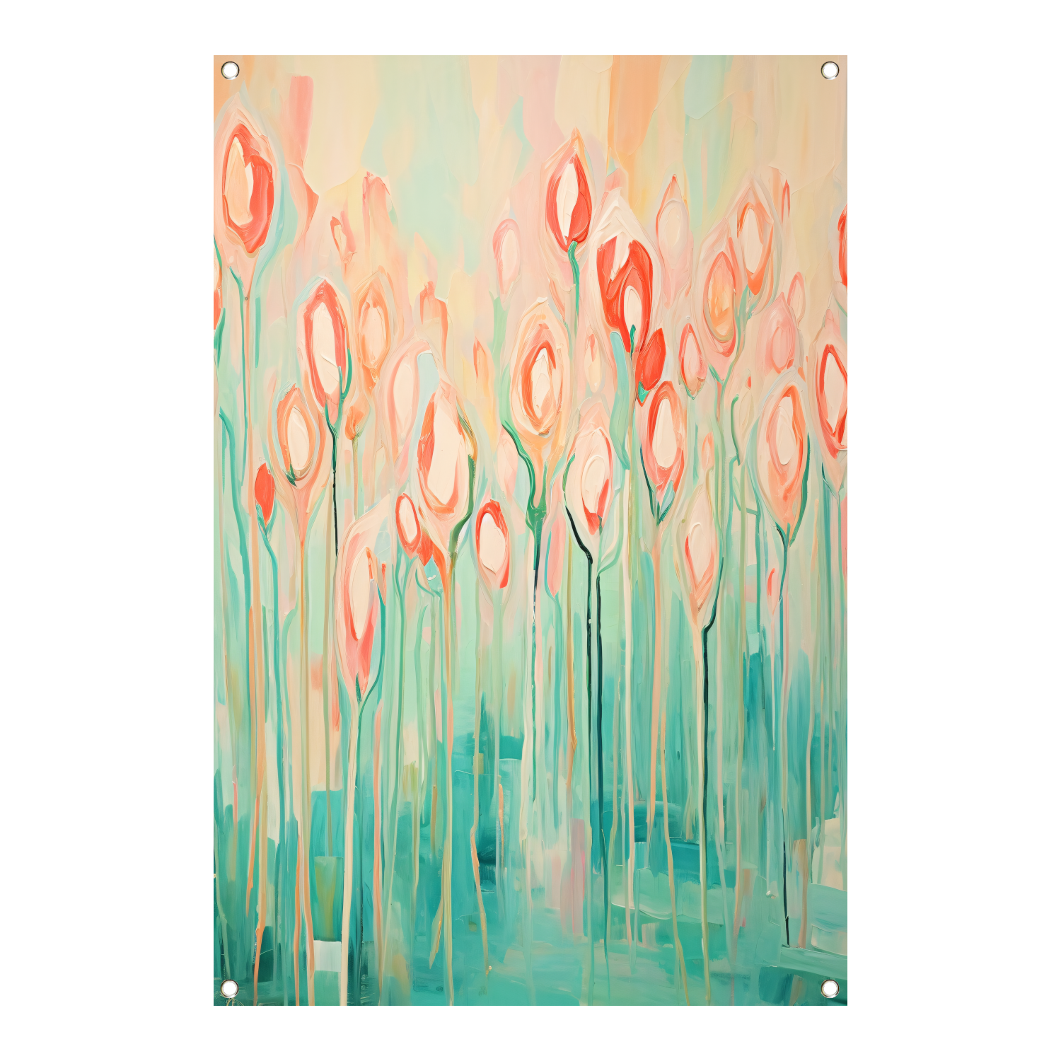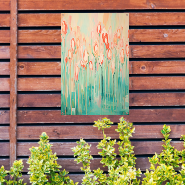 De stijl van deze tuinposter is modern en fris. Het close-up perspectief geeft een unieke kijk op de bloemen en zorgt voor een interessant contrast met de achtergrond. De poster is gemaakt van hoogwaardig materiaal en is bestand tegen verschillende weersomstandigheden. Hierdoor kun je het hele jaar door genieten van deze prachtige bloemen in jouw tuin.