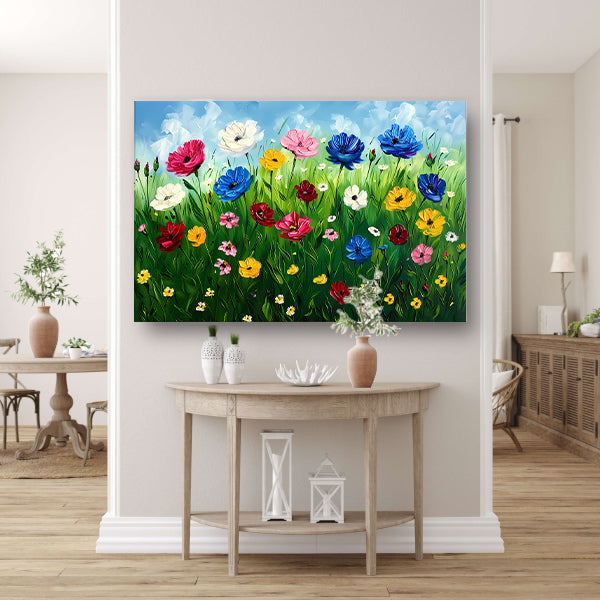 Kleurrijk bloemenveld onder een blauwe lucht poster