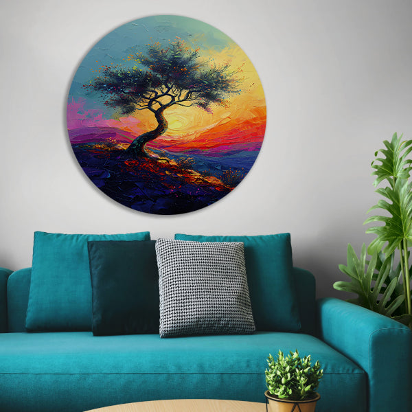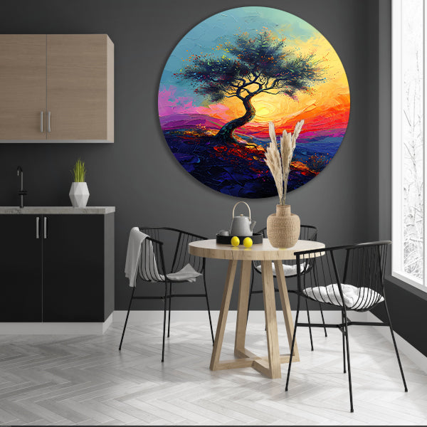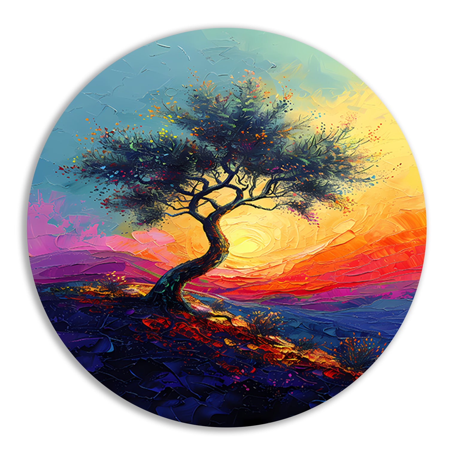 Kleurrijk boom in landschap bij zonsondergang aluminium muurcirkel