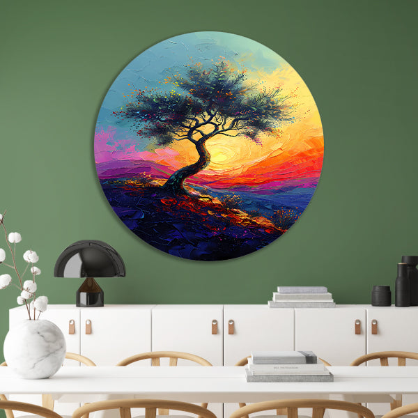 Kleurrijk boom in landschap bij zonsondergang forex muurcirkel