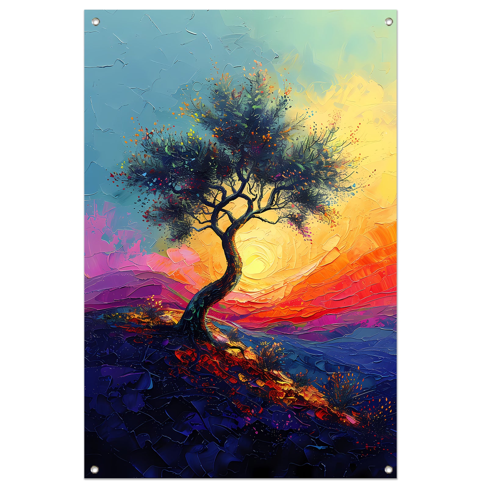 Kleurrijk boom in landschap bij zonsondergang tuinposter