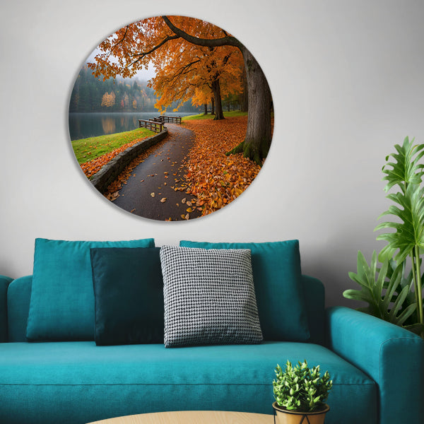 Breng de warme en sfeervolle herfstsfeer in huis met deze prachtige muurcirkel en geniet dagelijks van dit prachtige landschap aan je muur.