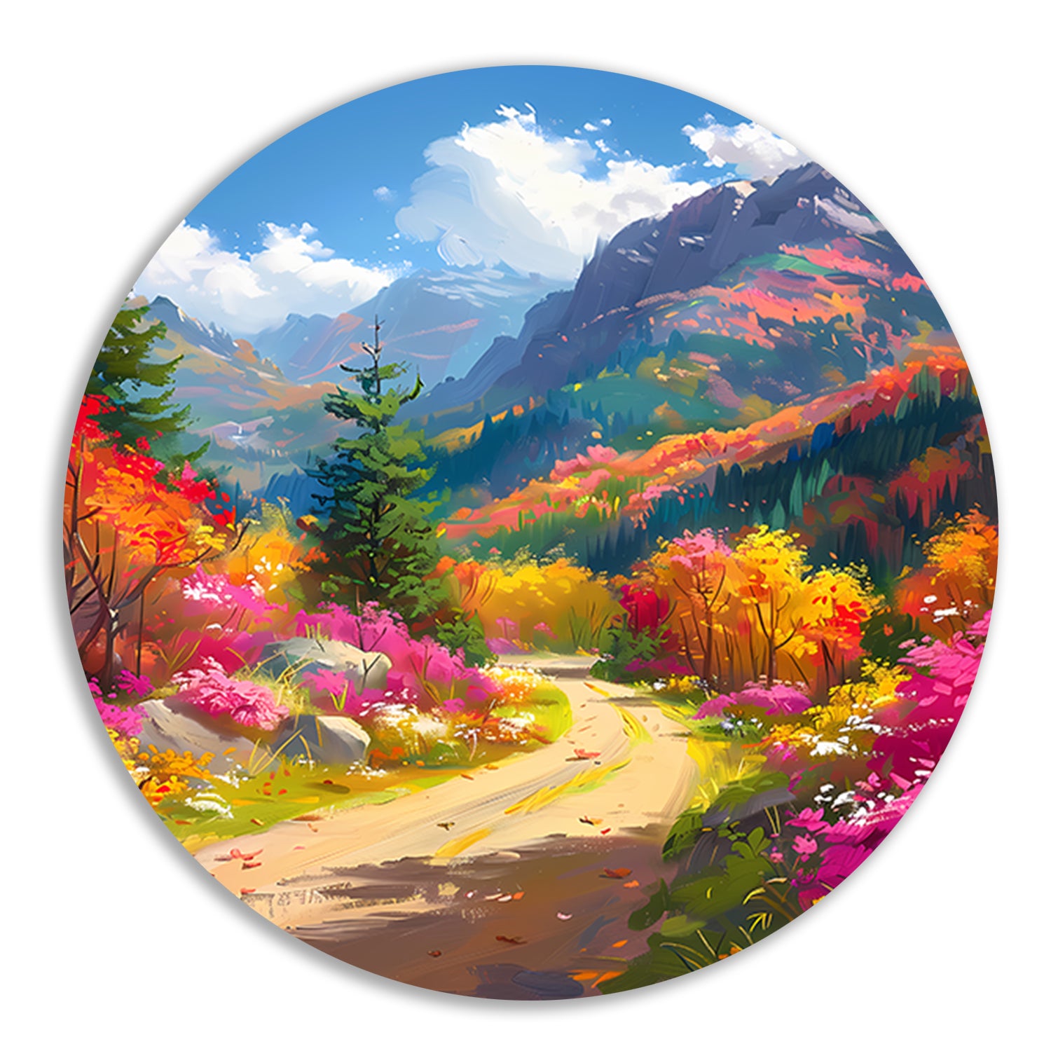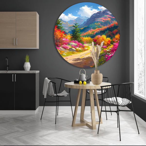 Kleurrijk herfstlandschap met bloemen en bergen forex muurcirkel