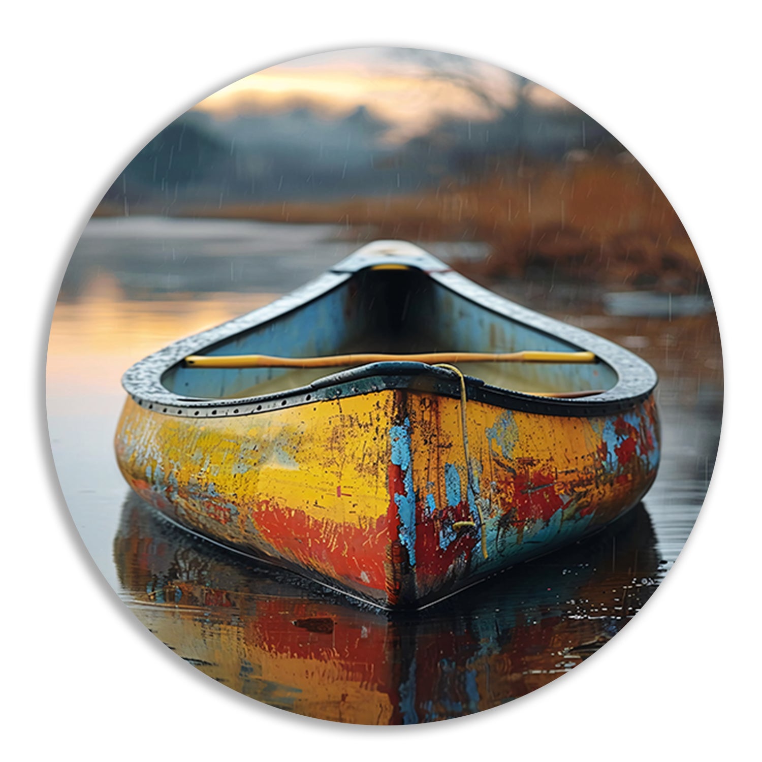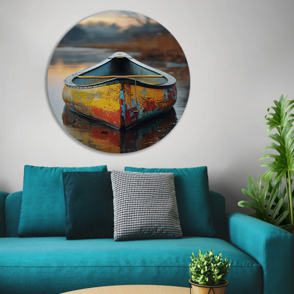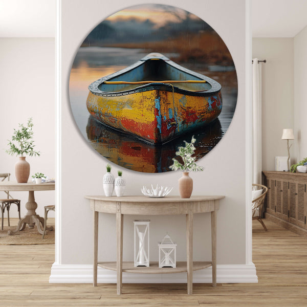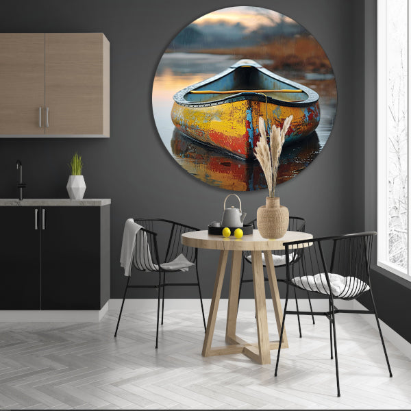 Breng de serene sfeer van een kano op rustig water in huis met deze kleurrijke muurcirkel en geniet dagelijks van de rustgevende uitstraling die het met zich meebrengt. Maak een statement in uw interieur met deze unieke en stijlvolle muurdecoratie.