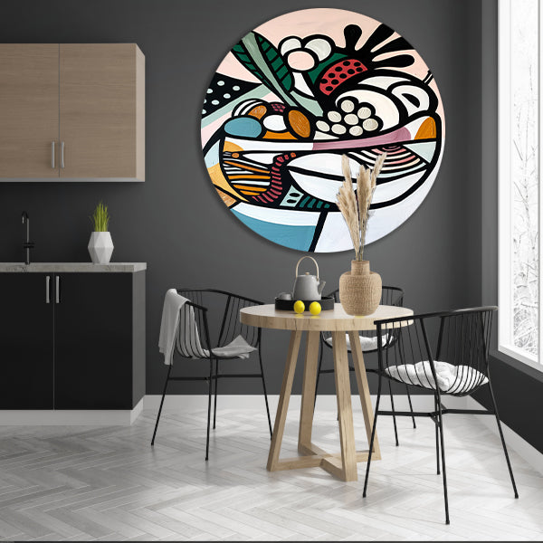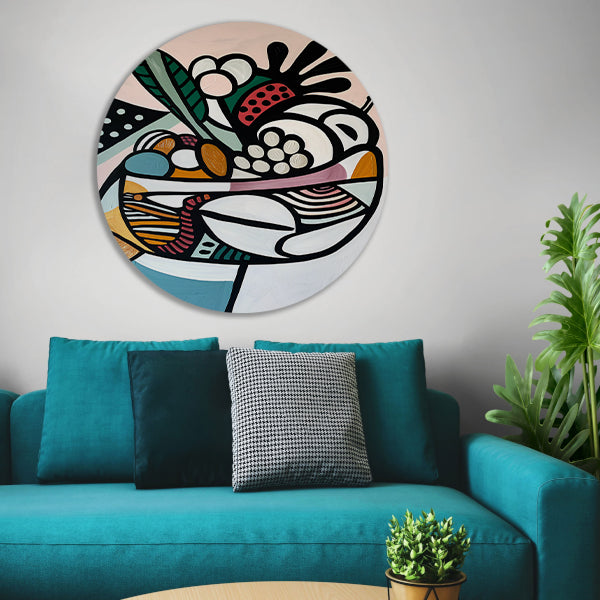 Breng een vleugje kunst en kleur in uw leven met dit prachtige kubistische schilderij van fruit op aluminium muurcirkel. Perfect voor liefhebbers van moderne en abstracte kunst.