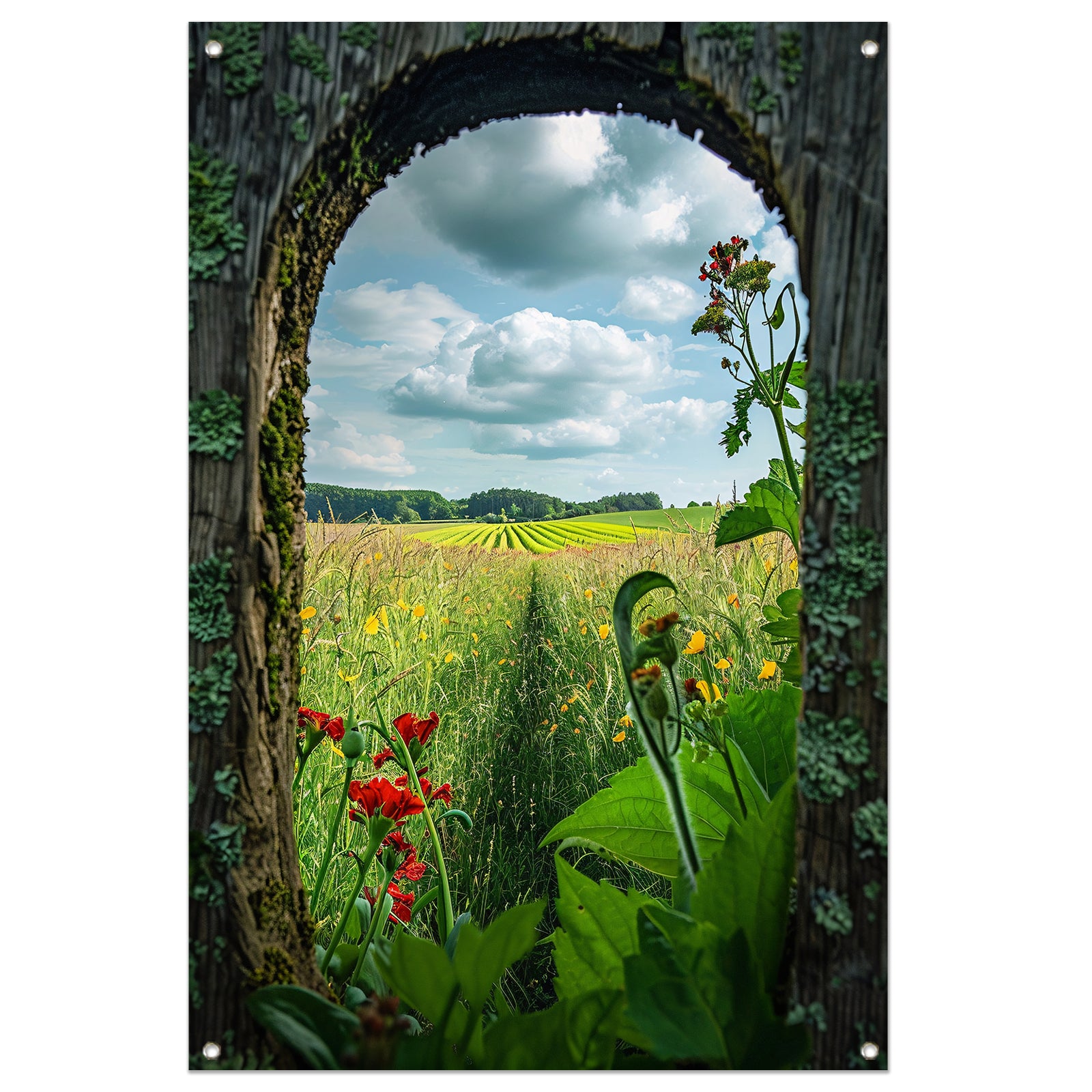 Kleurrijk landschap door houten venster tuinposter