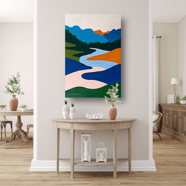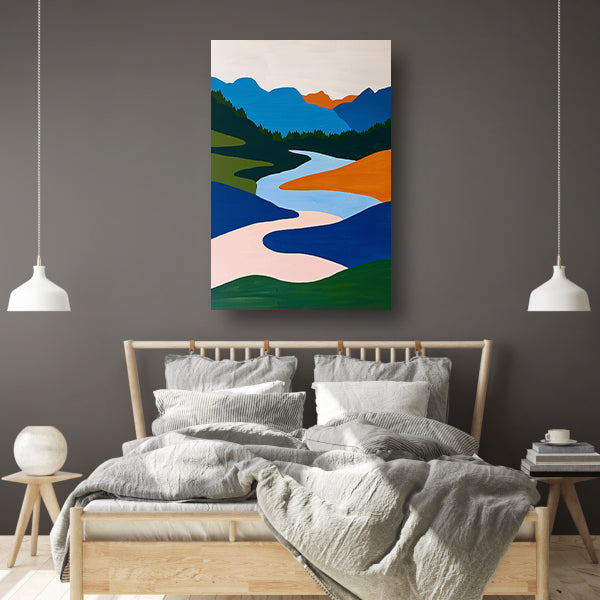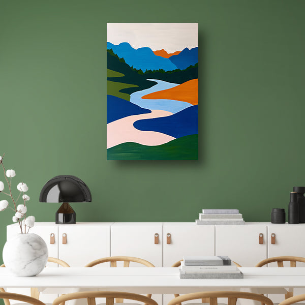 Kleurrijk minimalistisch schilderij van rivier en bergen canvas