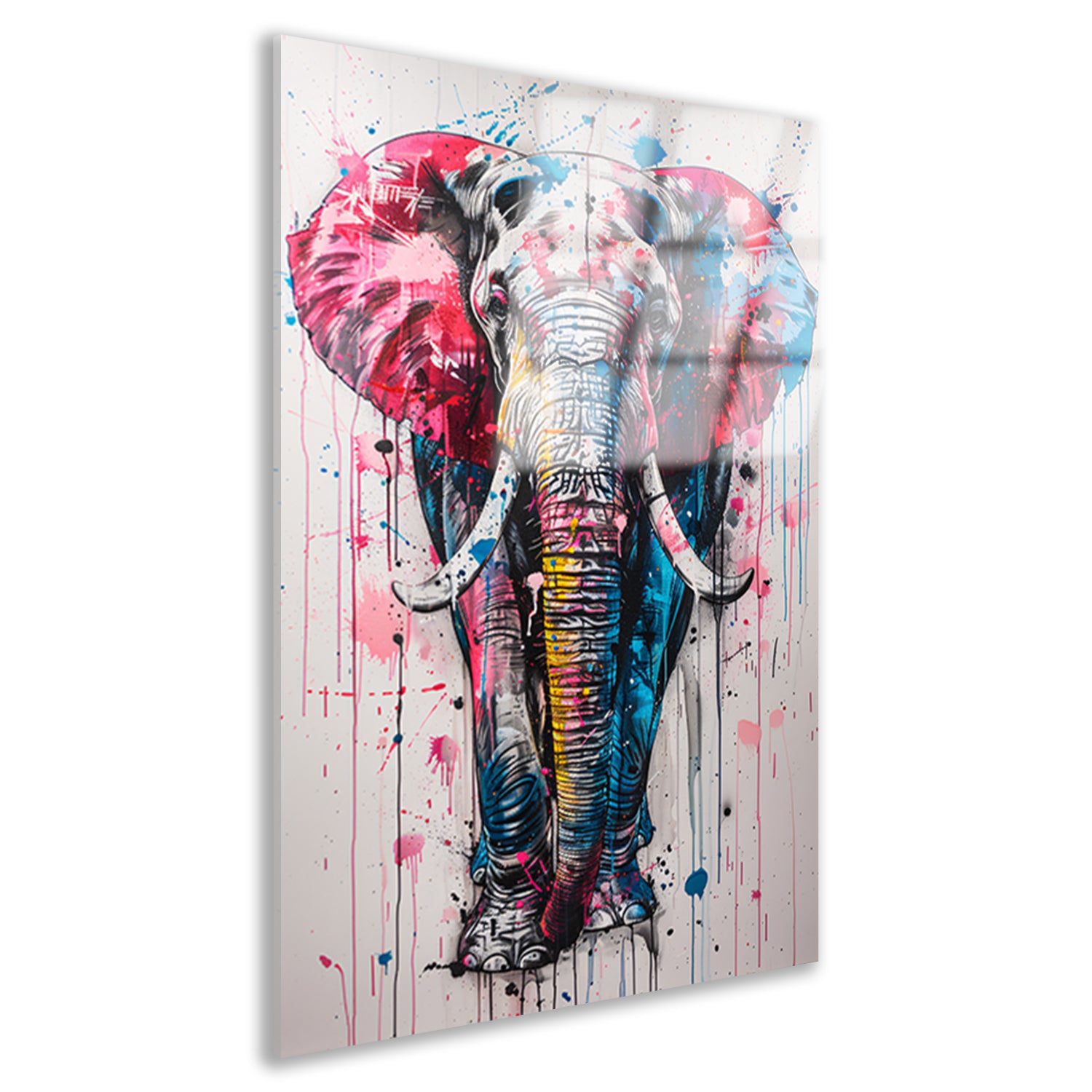 Kleurrijk olifantschilderij met dynamische verfspatten acrylglas
