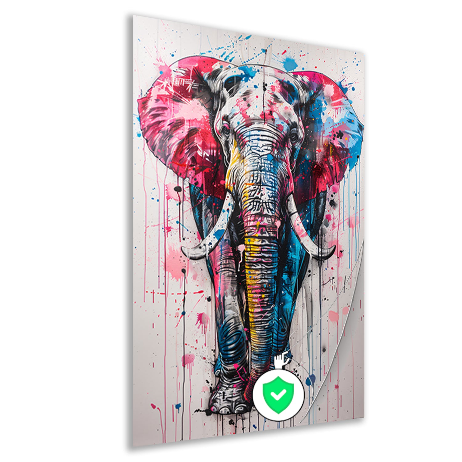 Kleurrijk olifantschilderij met dynamische verfspatten poster