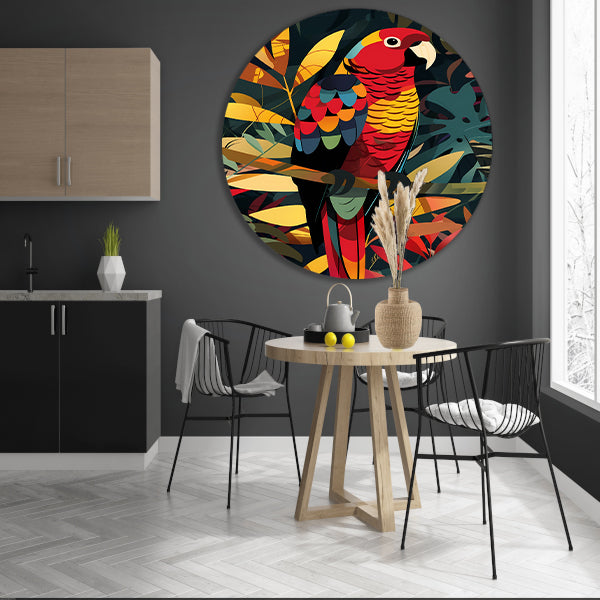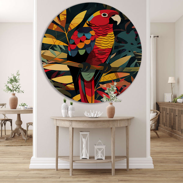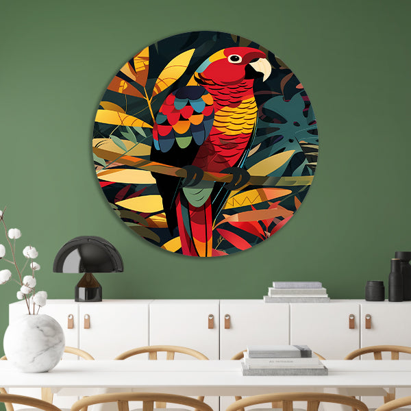 De levendige kleuren en gedetailleerde afbeelding van de papegaai zullen zeker een blikvanger zijn in elke ruimte. Of u nu op zoek bent naar een stukje natuurlijke flair voor uw woonkamer, slaapkamer of kantoor, deze muurcirkel zal zeker indruk maken.