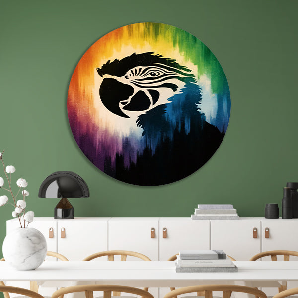 Voeg wat kleur en flair toe aan jouw ruimte met deze kleurrijke papegaai silhouet muurcirkel met abstracte achtergrond. Bestel nu en geef jouw interieur een unieke en creatieve uitstraling!