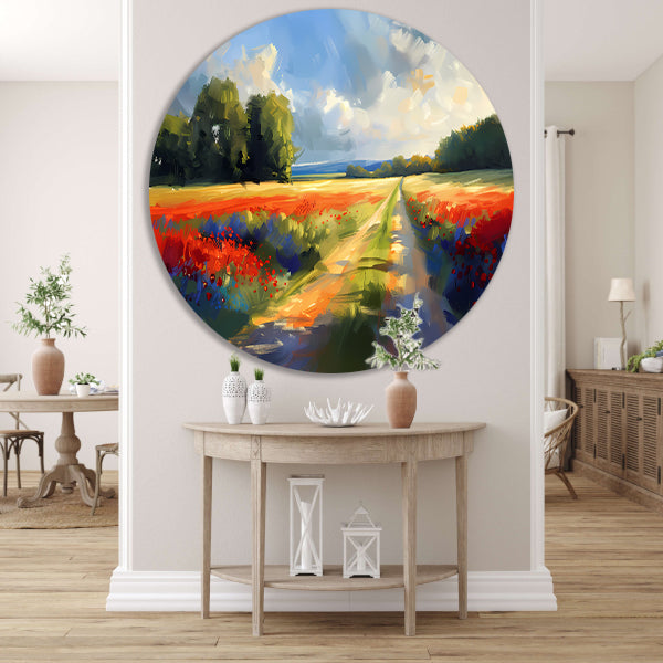 Kleurrijk schilderij van bloemenveld met bomen aluminium muurcirkel