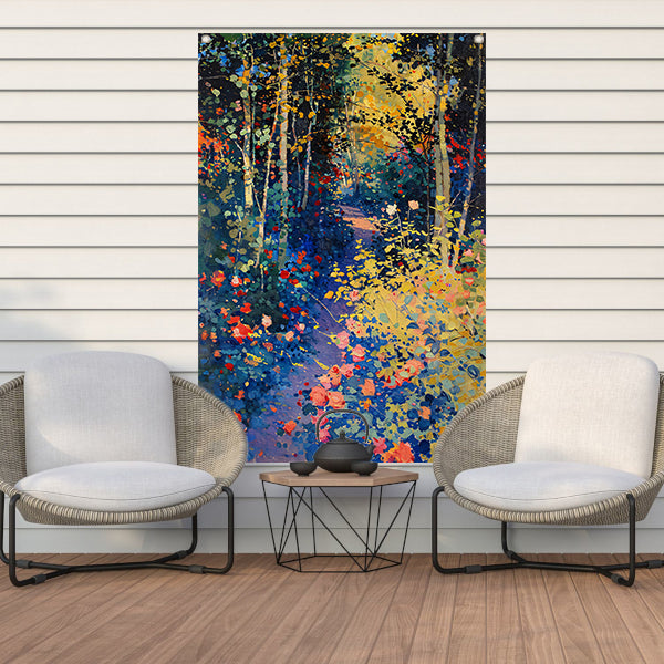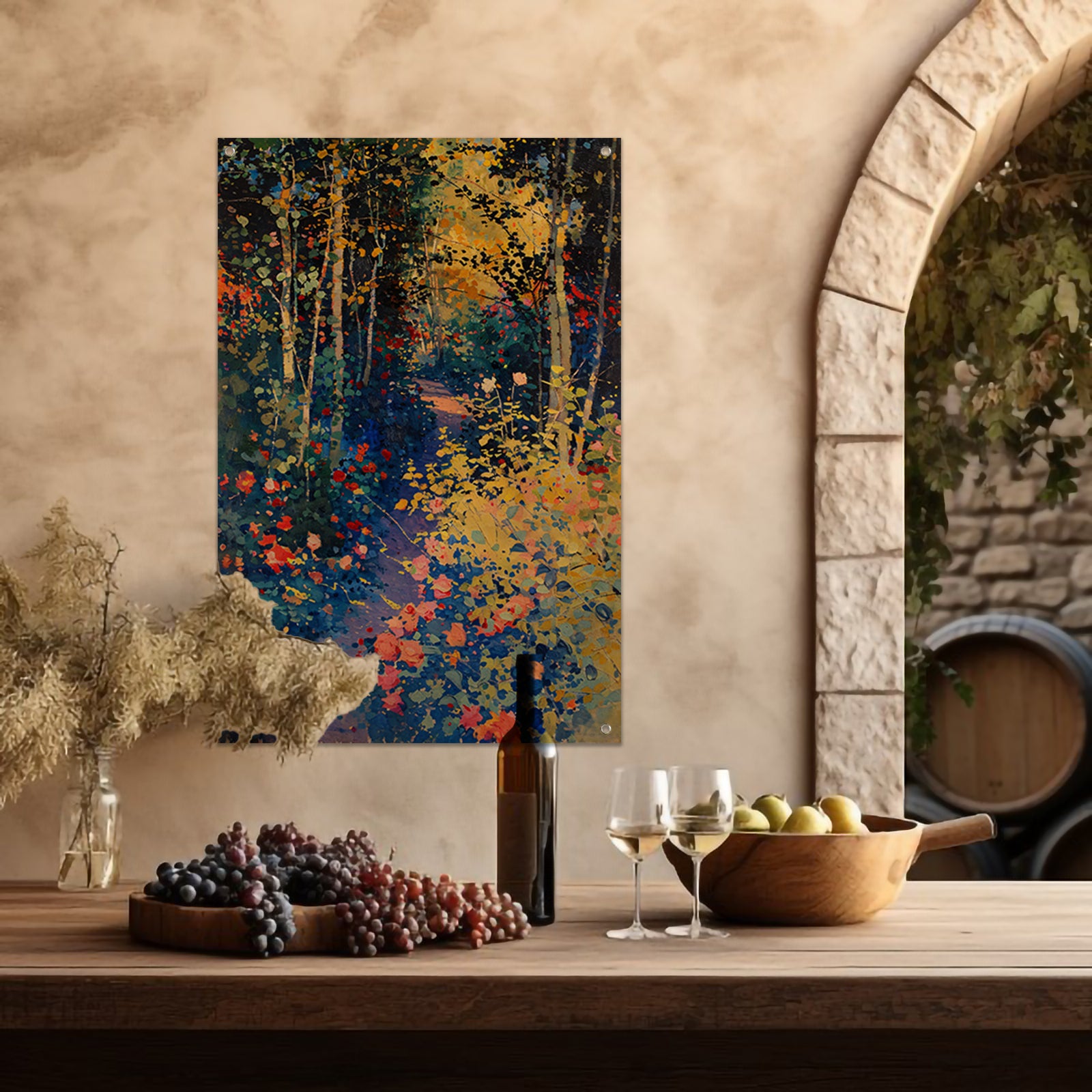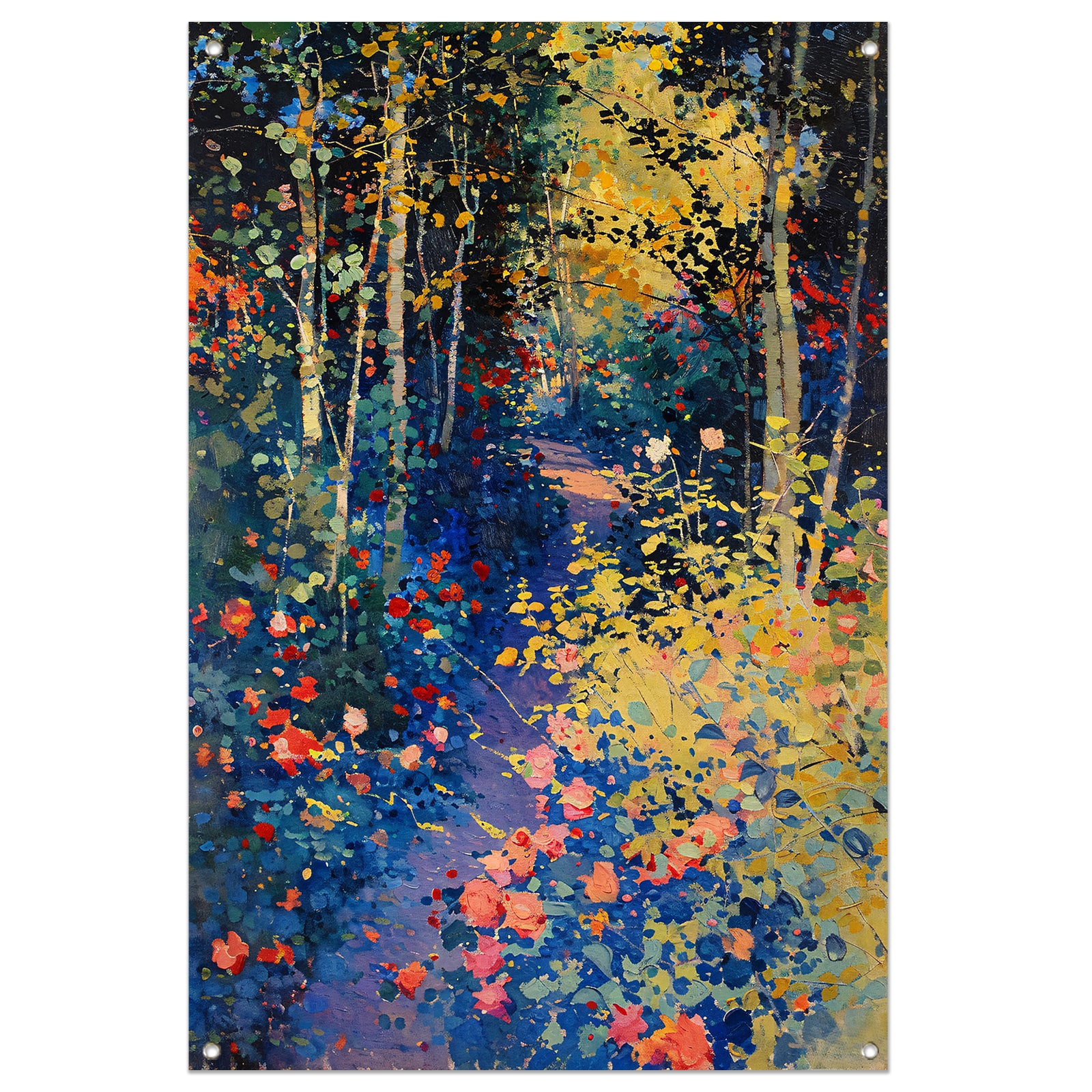 Kleurrijk schilderij van een bloemenrijk bos tuinposter