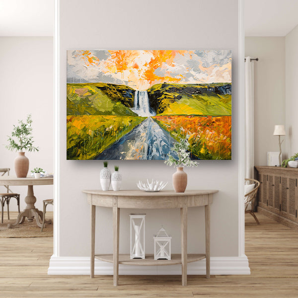 Kleurrijk schilderij van landschap met waterval canvas met baklijst