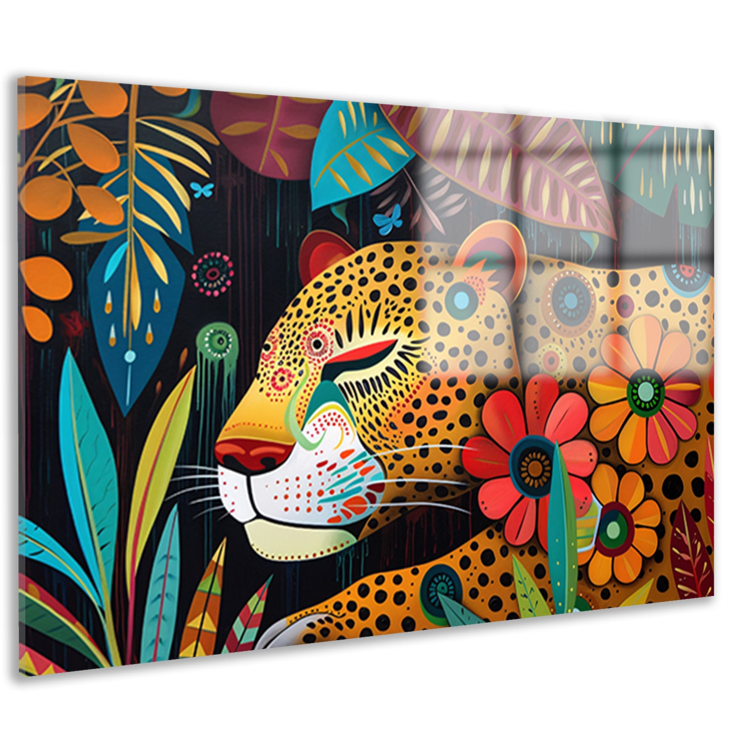 Kleurrijk schilderij van luipaard en bloemen acrylglas