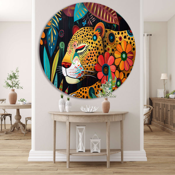 Kleurrijk schilderij van luipaard en bloemen aluminium muurcirkel