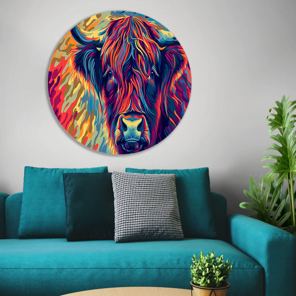 Kleurrijk schilderij van Schotse hooglander aluminium muurcirkel