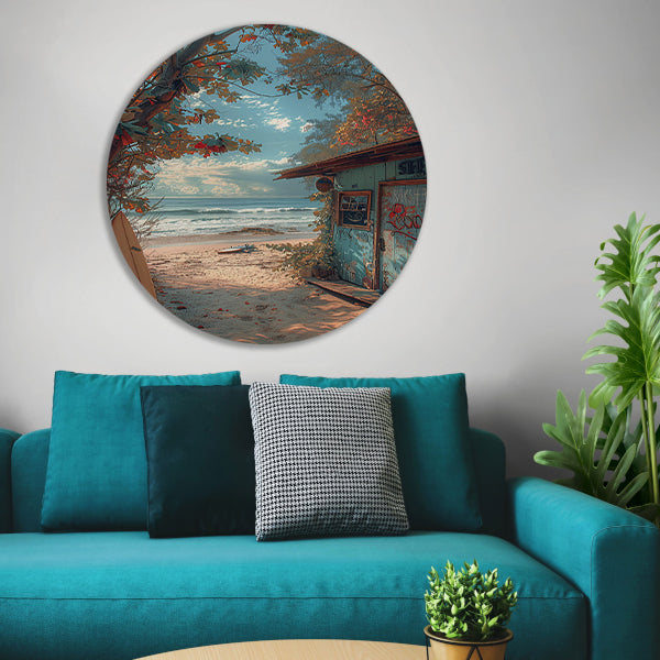 De afbeelding van het strandhuisje met surfplanken brengt meteen een zomers gevoel in huis en is perfect voor liefhebbers van de kust en surfen. De muurcirkel is verkrijgbaar in allerlei formaten, zodat je altijd een formaat kunt kiezen dat past bij jouw interieur.