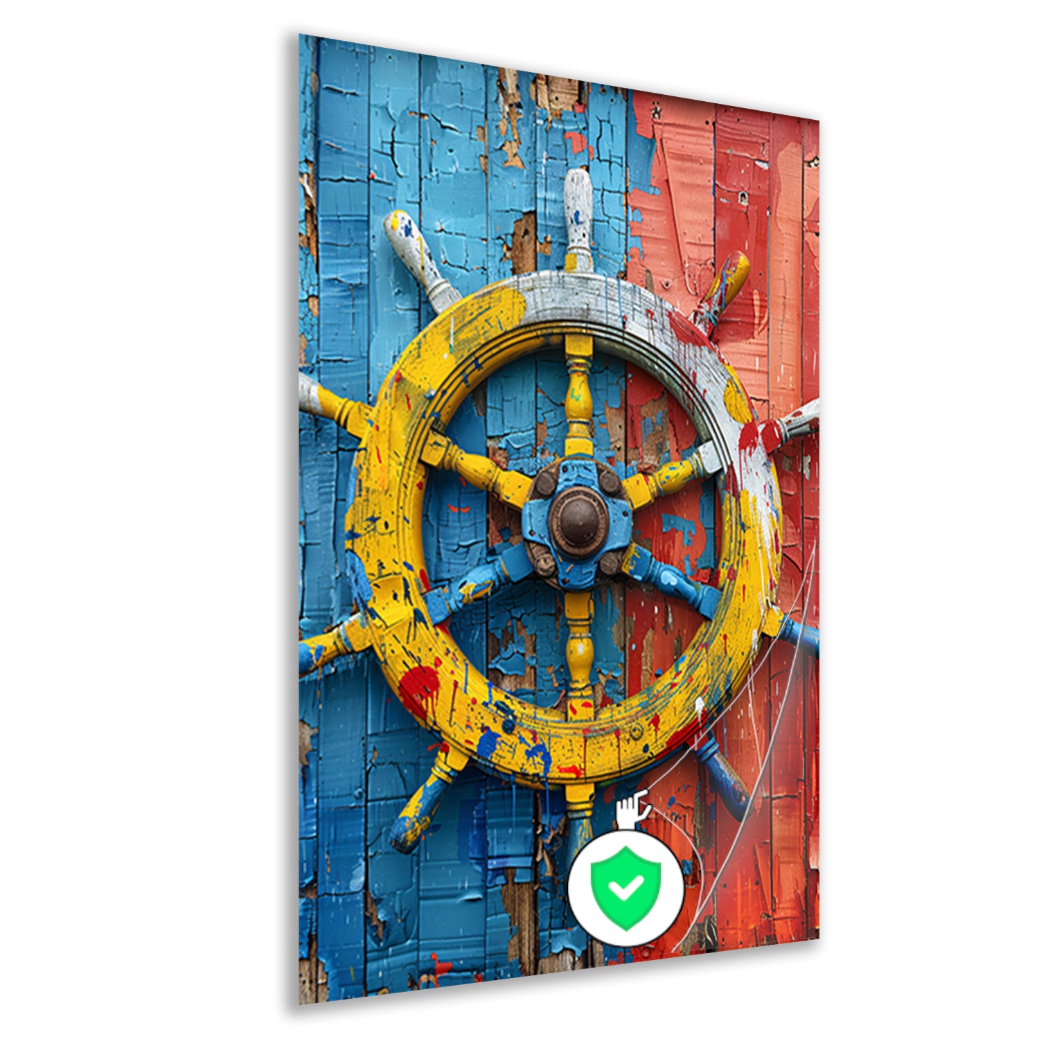 Kleurrijk Stuurwiel op Verweerde Houten Muur poster