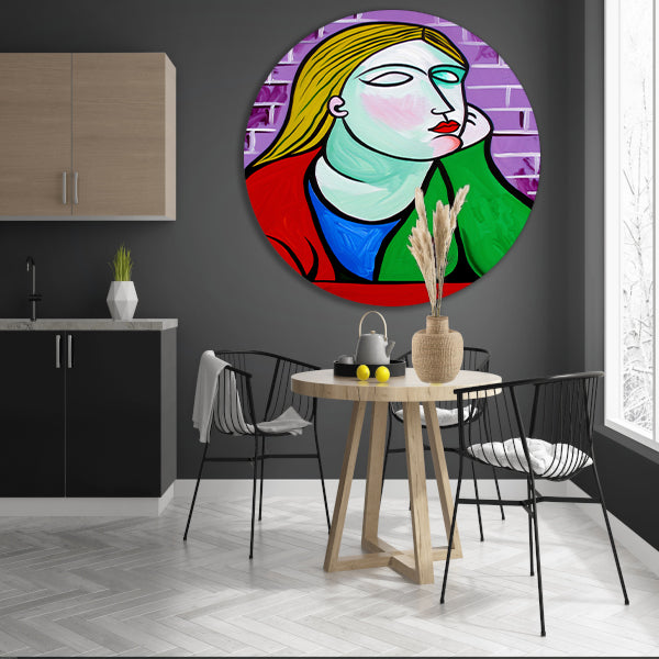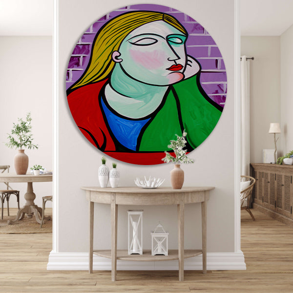 Breng kleur en creativiteit in huis met deze prachtige muurcirkel van een kleurrijke vrouw in gedachten. Een uniek en stijlvol kunstwerk dat je interieur direct een boost geeft!