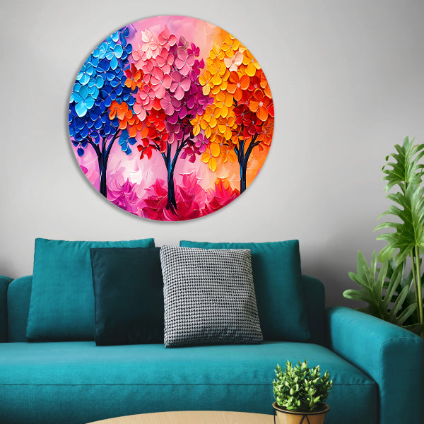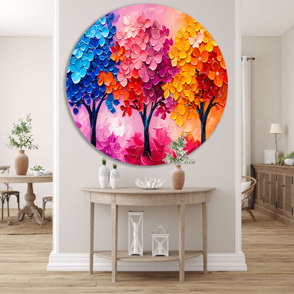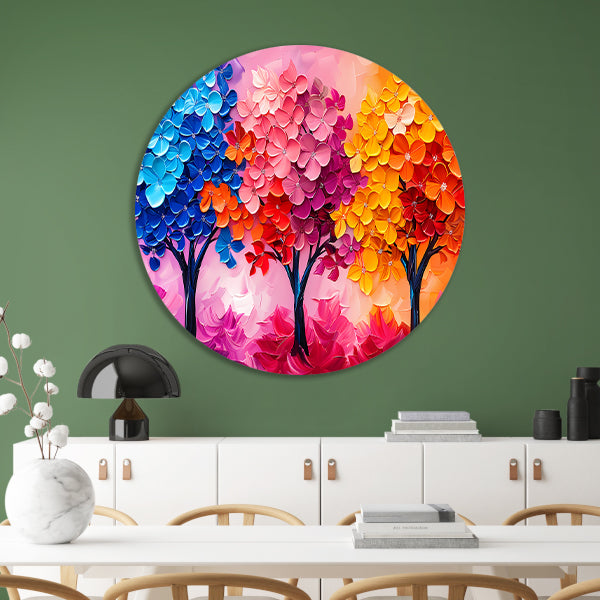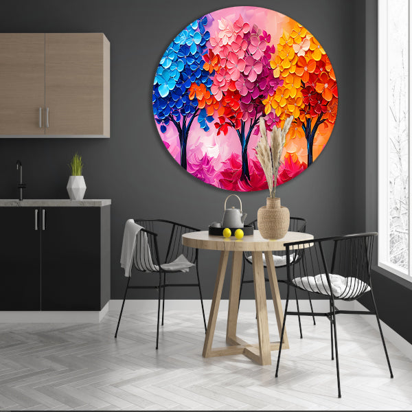 Kleurrijke abstracte bomen en bloemen schilderij aluminium muurcirkel