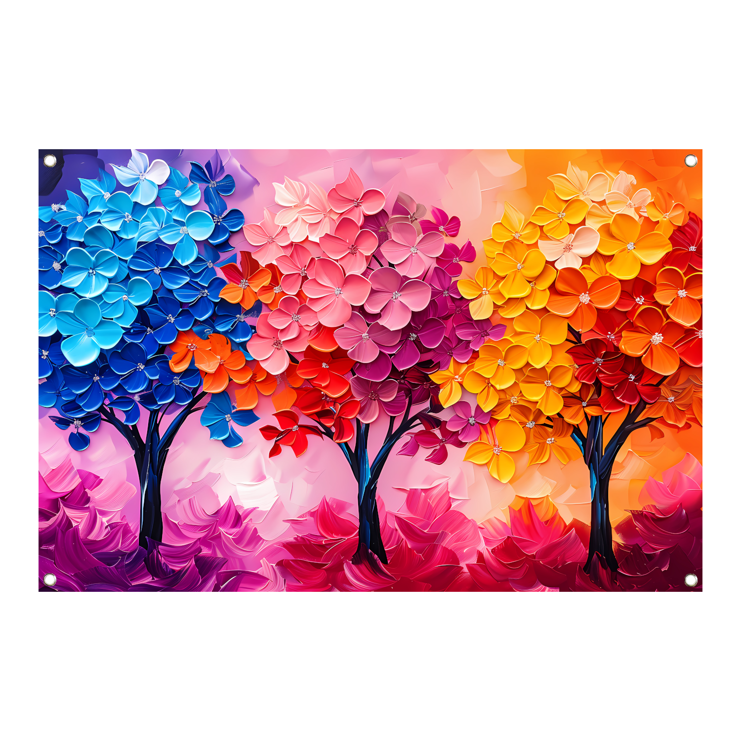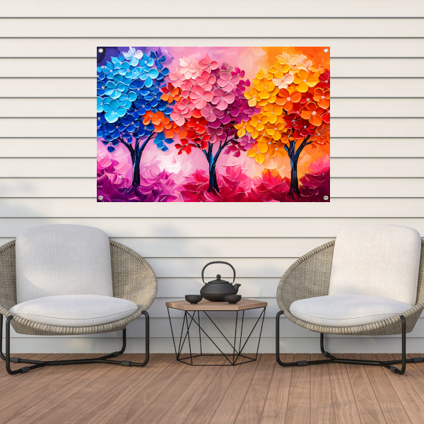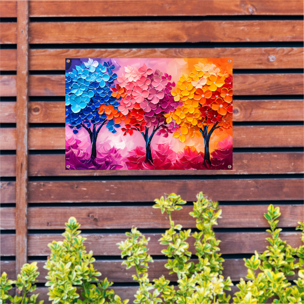 Kleurrijke abstracte bomen en bloemen schilderij tuinposter