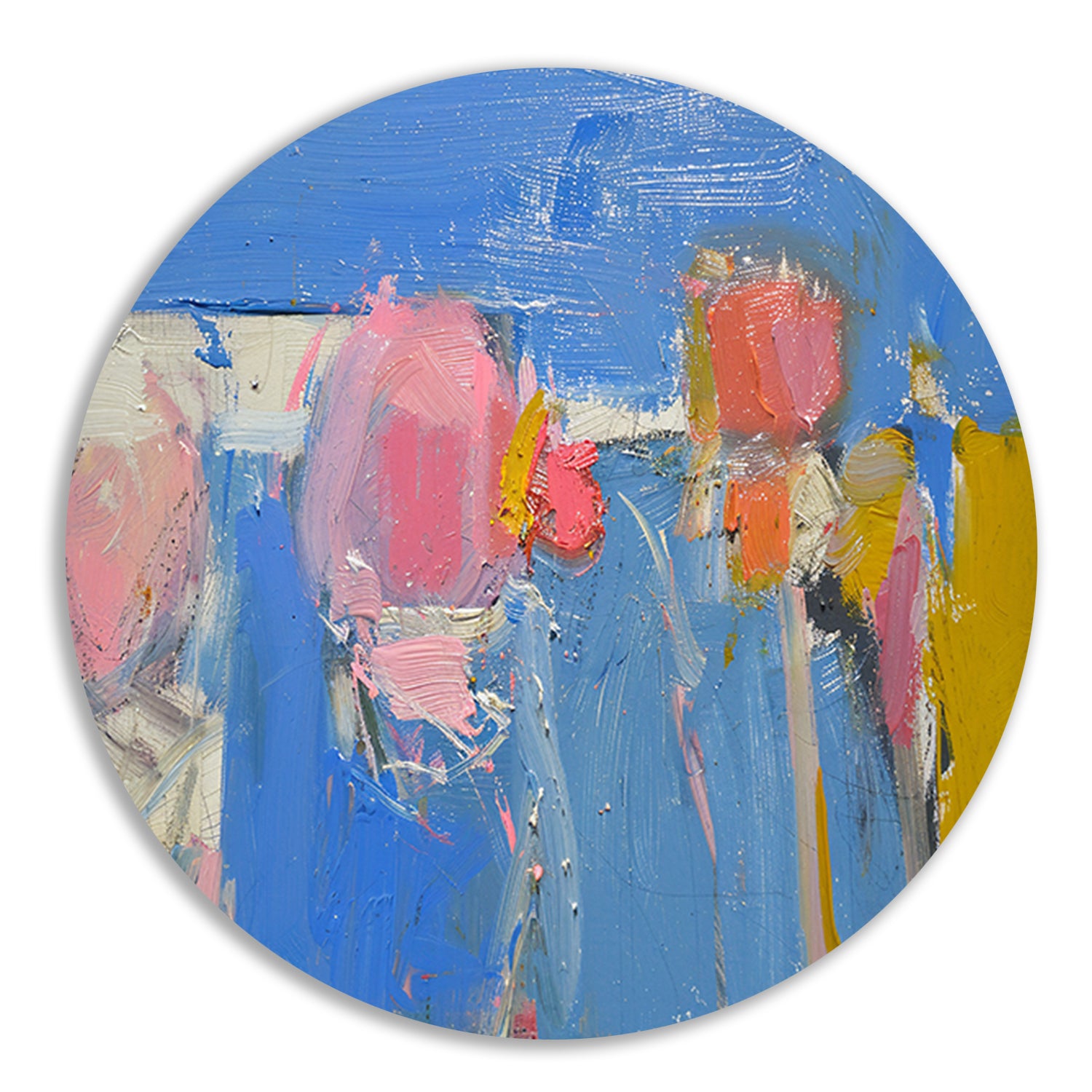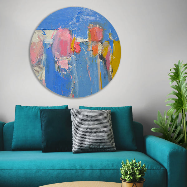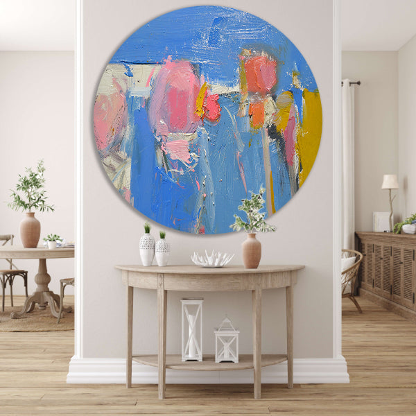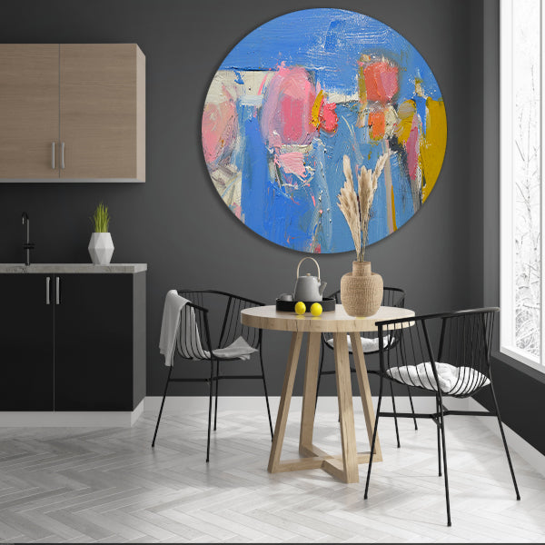 Deze muurcirkel is verkrijgbaar in diverse maten, zodat je de perfecte afmeting kunt kiezen voor jouw ruimte. Of je nu een opvallend statement wilt maken in de woonkamer of een speelse touch wilt toevoegen aan de slaapkamer, dit kleurrijke abstracte schilderij past bij elke interieurstijl.
