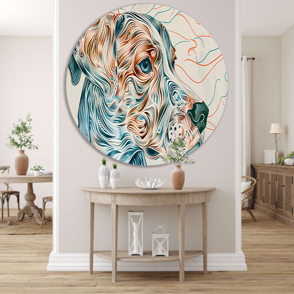 Voeg een speelse en artistieke touch toe aan je interieur met deze prachtige kleurrijke abstracte hond lijntekening schilderij op een aluminium muurcirkel. Bestel vandaag nog en geniet van de levendige kleuren en unieke uitstraling van dit kunstwerk.