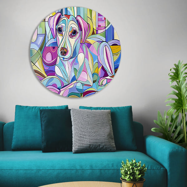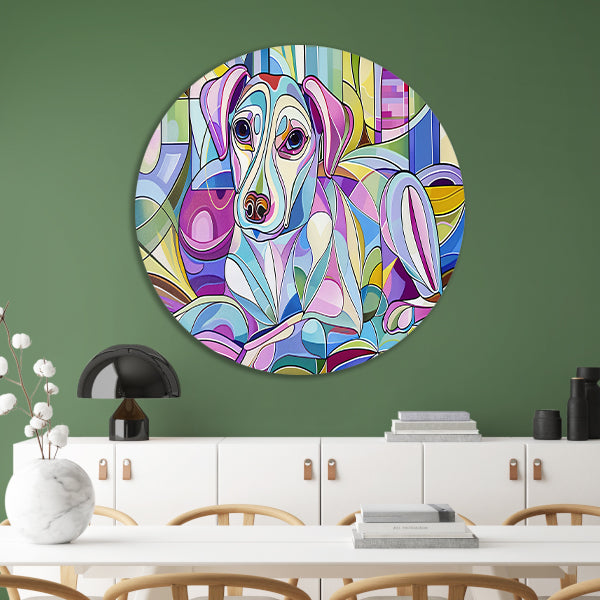 Voeg een vleugje originaliteit toe aan jouw huis of kantoor met deze prachtige muurcirkel en geniet elke dag van de levendige kleuren en de unieke uitstraling van deze abstracte illustratie van een hond.
