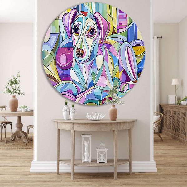Of je nu een dierenliefhebber bent of gewoon op zoek bent naar een opvallend kunstwerk voor aan de muur, deze kleurrijke abstracte illustratie van een hond is een echte eyecatcher! Voeg hem toe aan je interieur en geniet van de levendige kleuren en unieke uitstraling die deze muurcirkel met zich meebrengt.