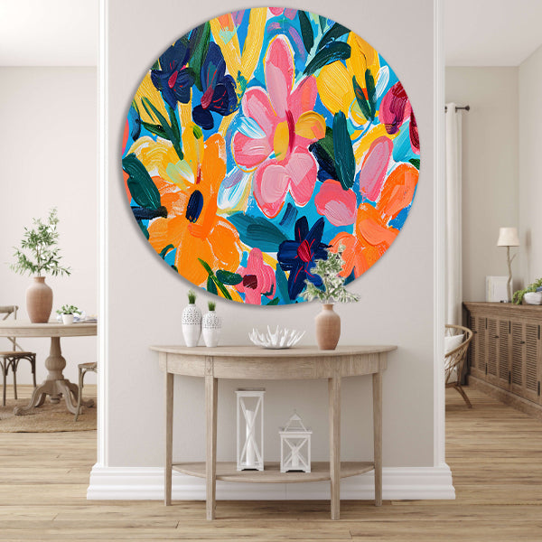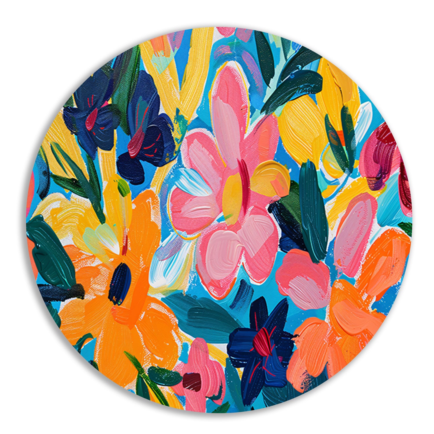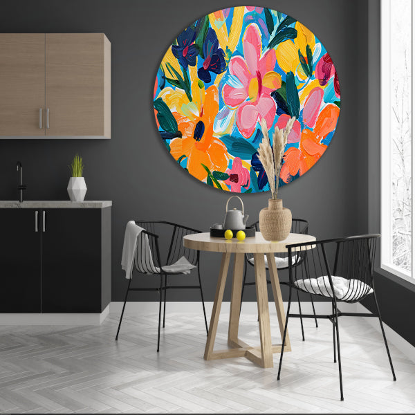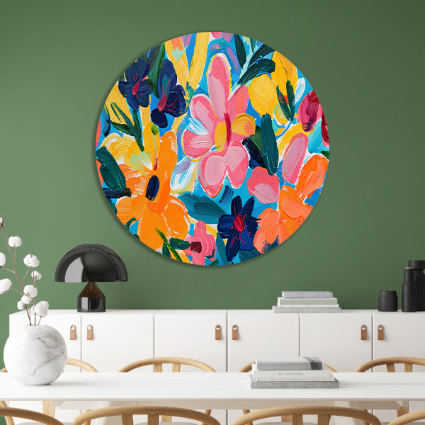 Kleurrijke abstracte impressie van bloemen en bladeren aluminium muurcirkel