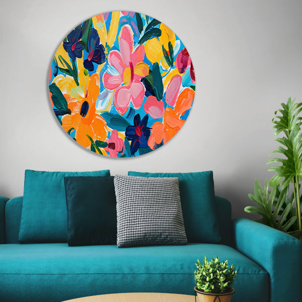 Kleurrijke abstracte impressie van bloemen en bladeren forex muurcirkel