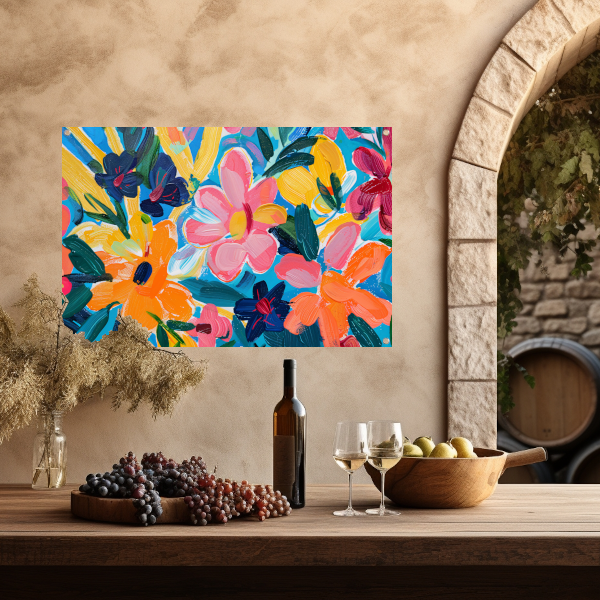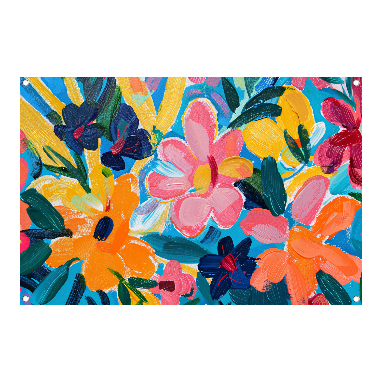 Kleurrijke abstracte impressie van bloemen en bladeren tuinposter