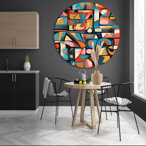 Kies voor deze kleurrijke abstracte kubistische patronen aluminium muurcirkel en geef jouw interieur een unieke en artistieke touch!