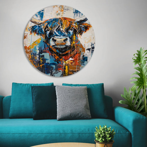 Voeg een vleugje creativiteit en kleur toe aan je interieur met dit prachtige abstracte schilderij van een Schotse hooglander op een forex muurcirkel. Perfect voor liefhebbers van kunst en dierenliefhebbers die op zoek zijn naar een uniek en opvallend kunstwerk voor aan de muur.