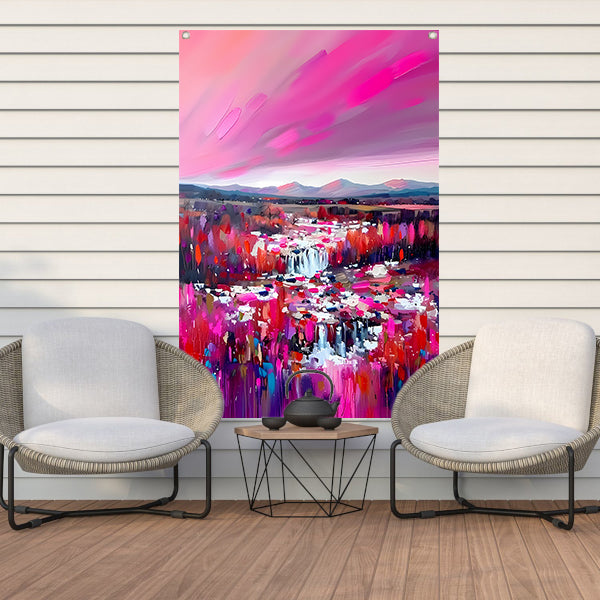 Kleurrijke abstracte waterval met levendig landschap tuinposter