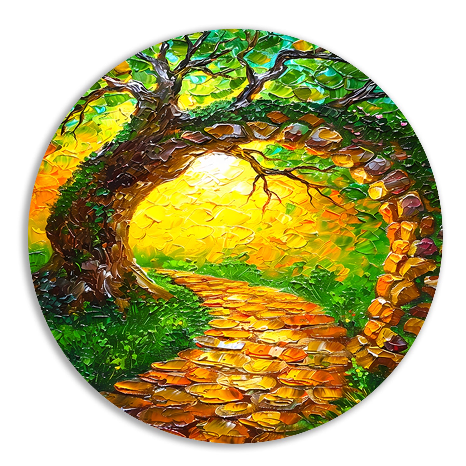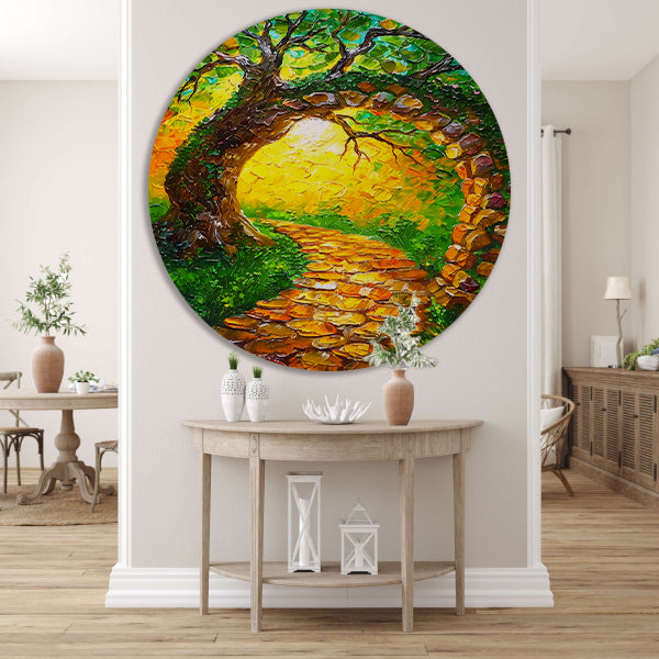 Kleurrijke boom met pad in zonlicht aluminium muurcirkel