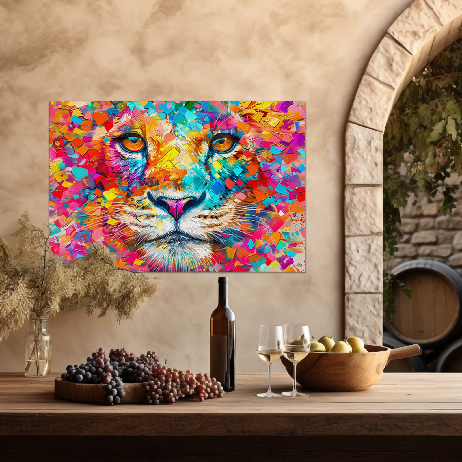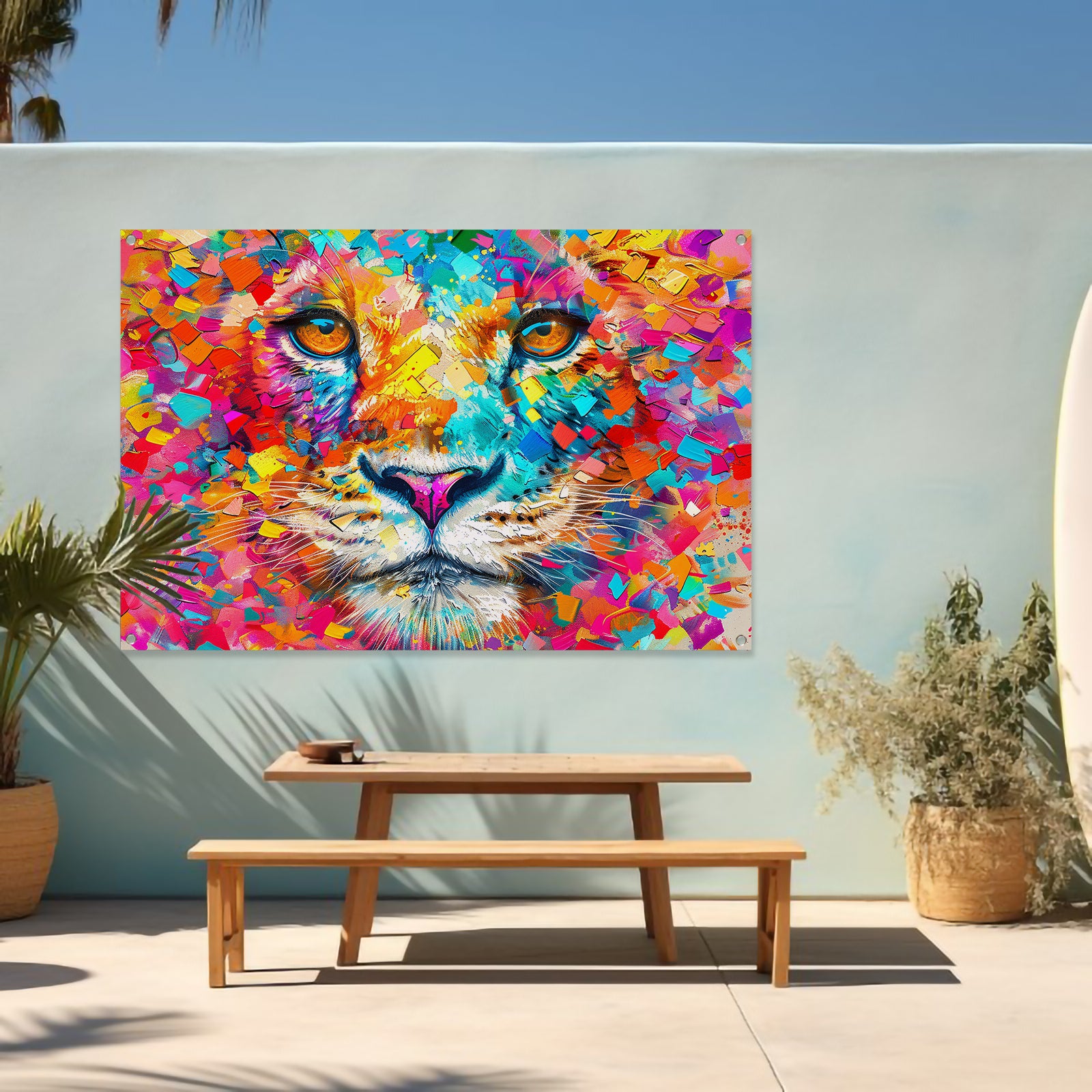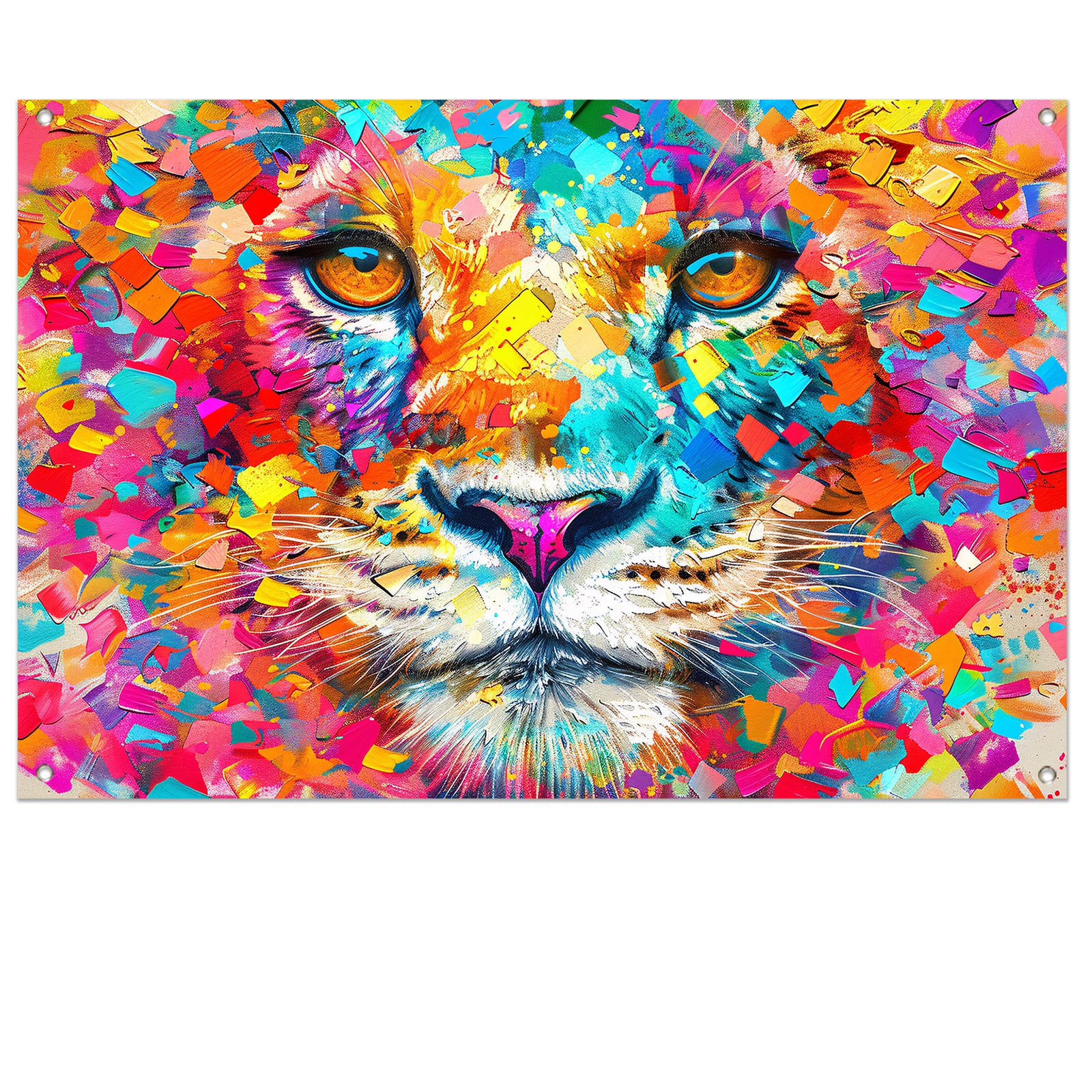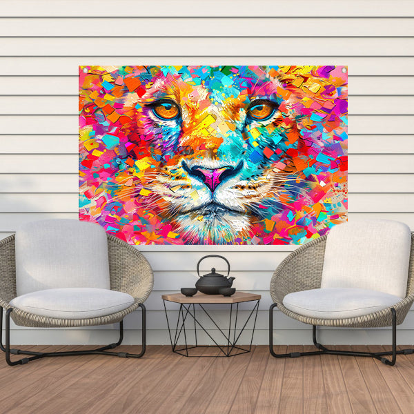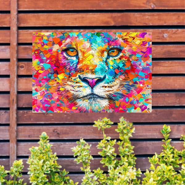 Kleurrijke en surrealistische leeuwenillustratie tuinposter