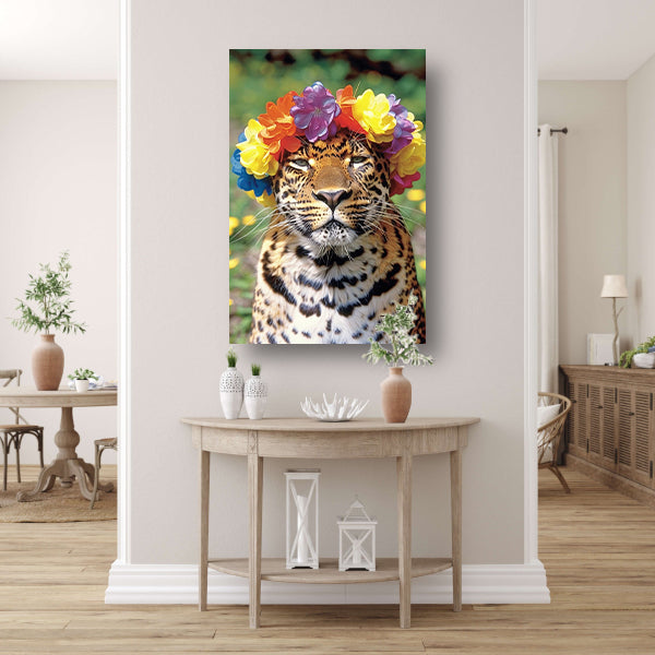 Kleurrijke Leopard met Bloemenkrans Portret acrylglas