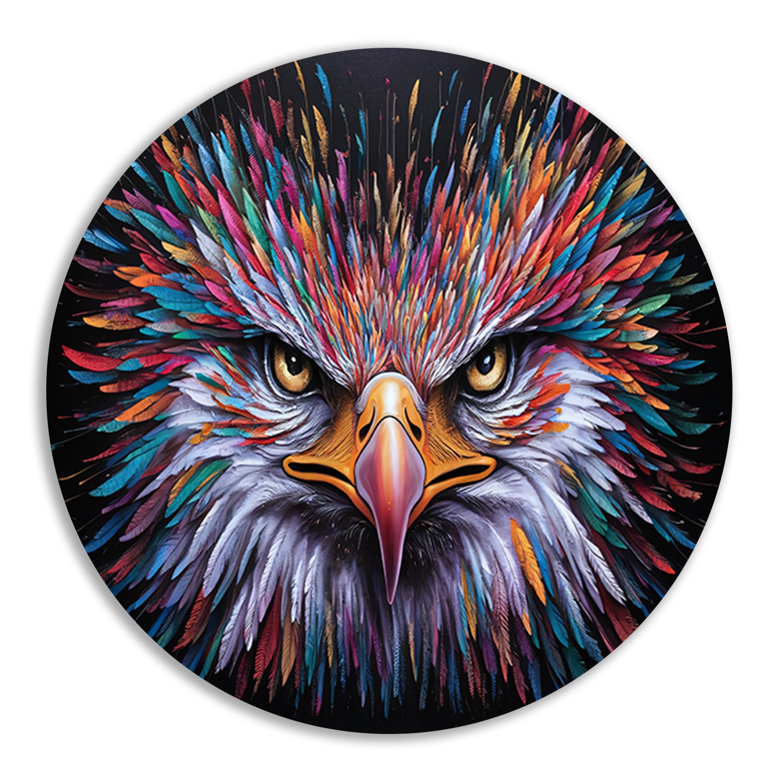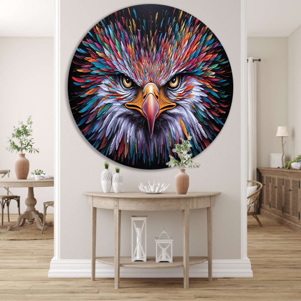 Kleurrijke psychedelische adelaar print voor inrichting aluminium muurcirkel