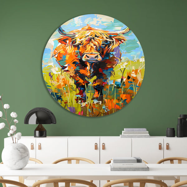 Kleurrijke Schotse hooglander in expressief schilderij aluminium muurcirkel