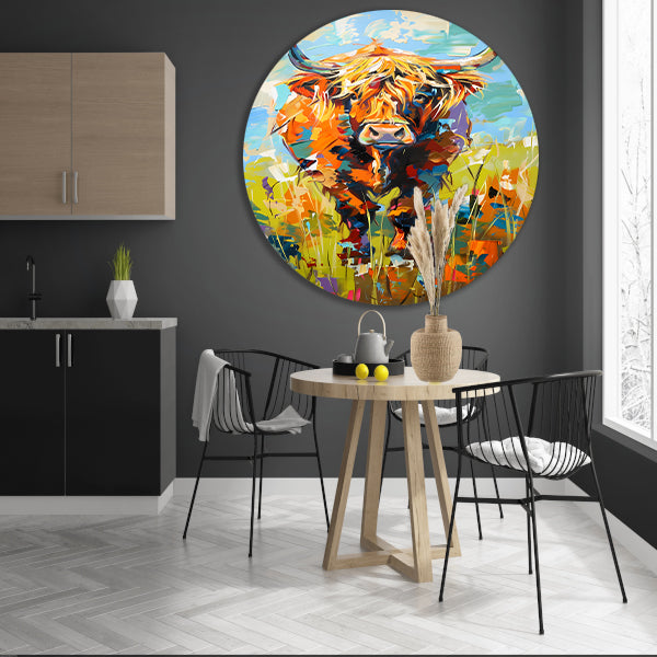 Kleurrijke Schotse hooglander in expressief schilderij forex muurcirkel