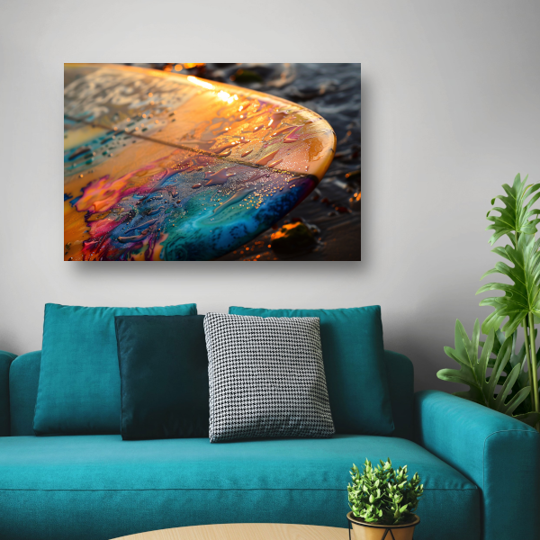 De afbeelding is verkrijgbaar in diverse formaten, zodat je kunt kiezen welke maat het beste past bij jouw ruimte. Of je nu op zoek bent naar een blikvanger voor in de woonkamer, slaapkamer of kantoor, deze surfplank in de zee zal zeker de aandacht trekken.