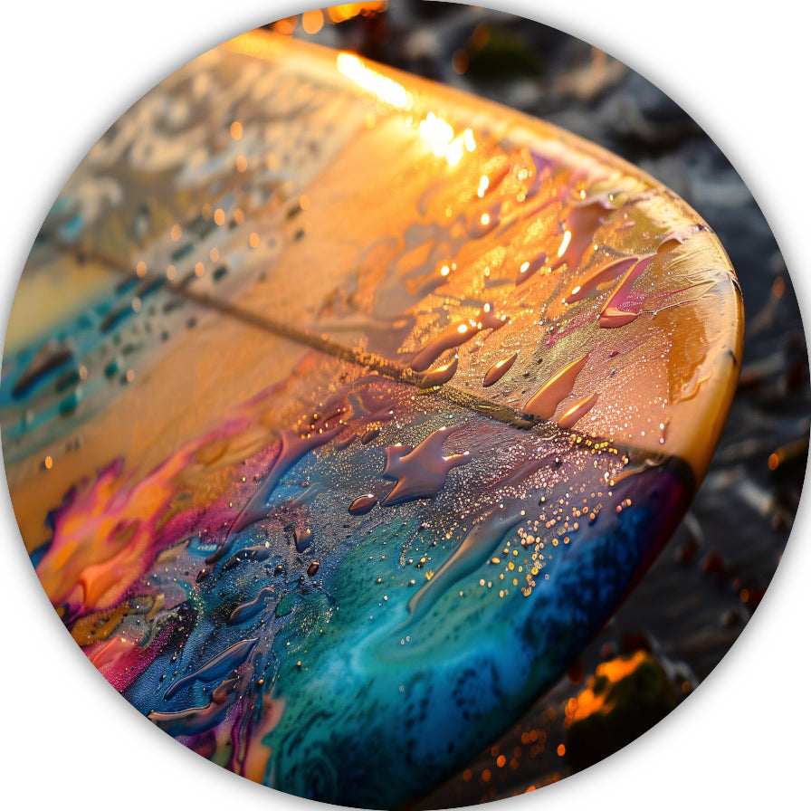 Kleurrijke Surfplank in Glinsterende Zee bij Zonsondergang forex muurcirkel