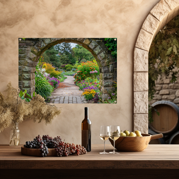 Kleurrijke Tuin door Stenen Boog tuinposter