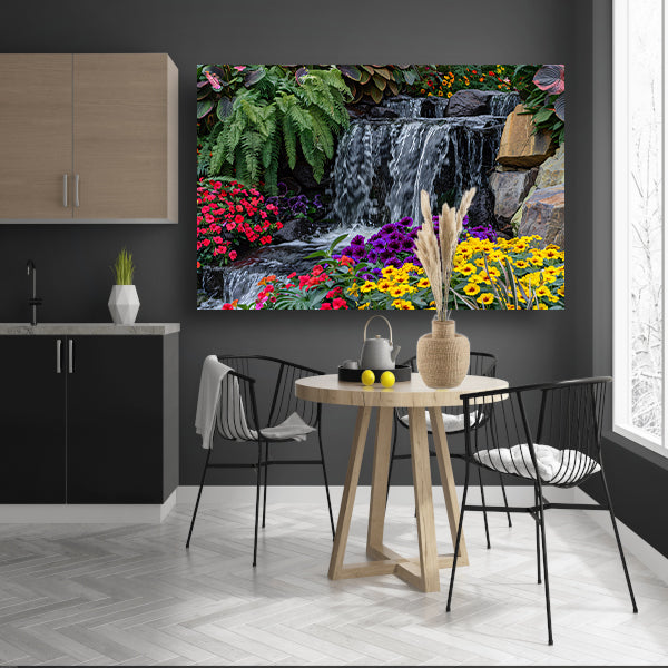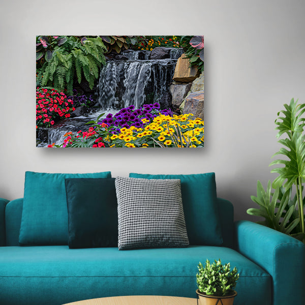 Kleurrijke tuin met bloemen en waterval canvas met baklijst