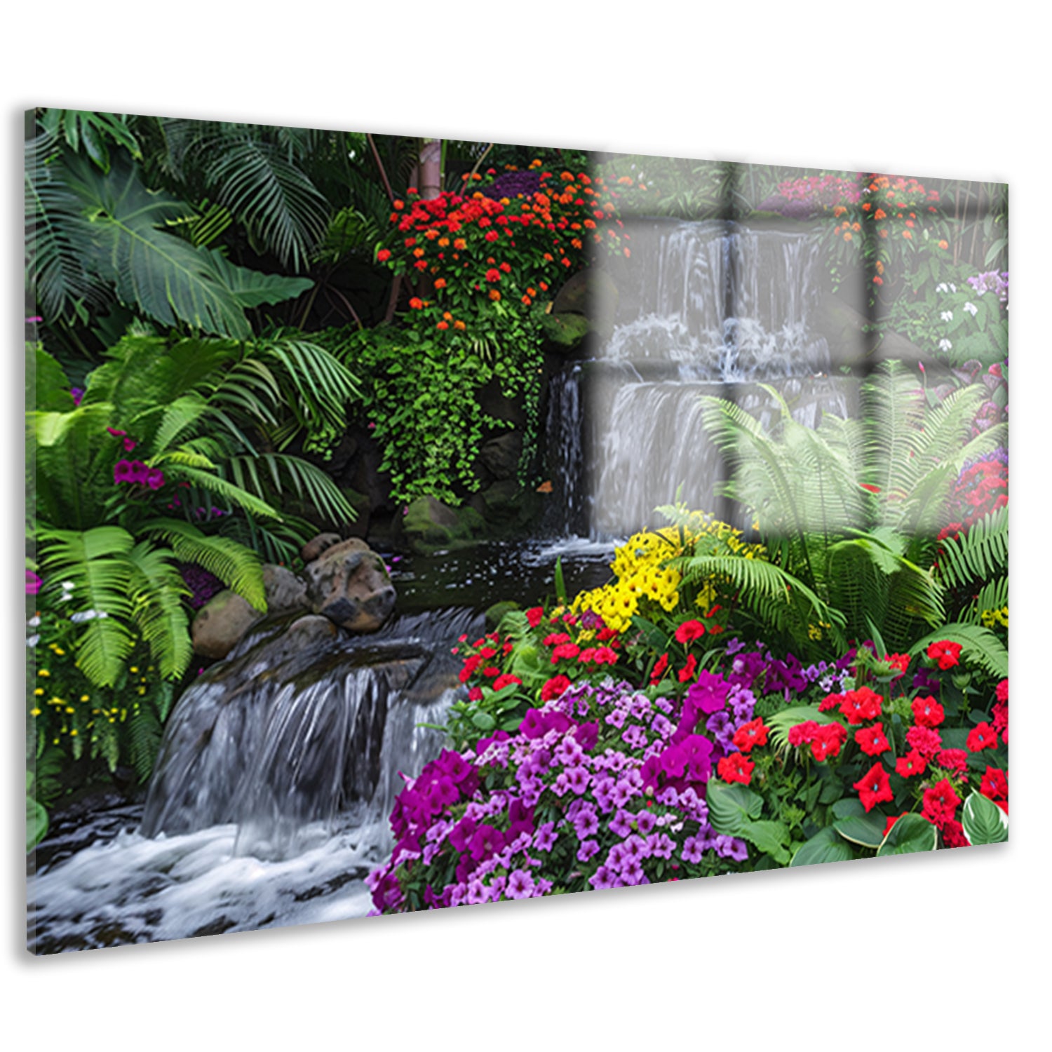 Kleurrijke tuin met waterval en diverse bloemen acrylglas