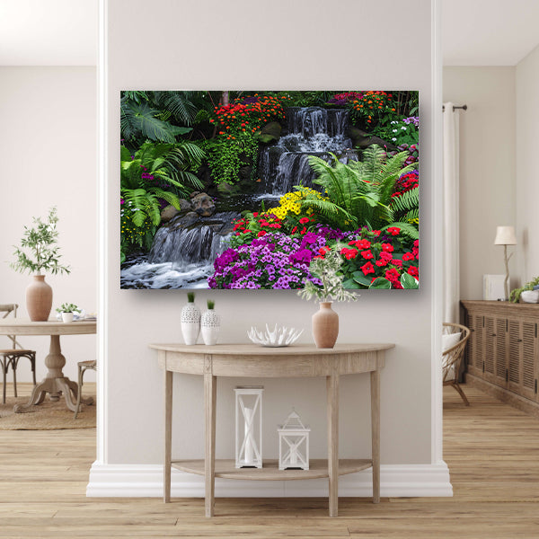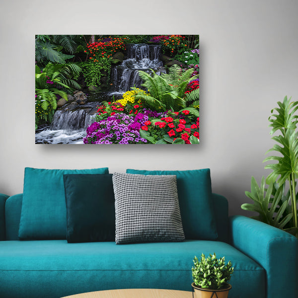 Kleurrijke tuin met waterval en diverse bloemen canvas met baklijst