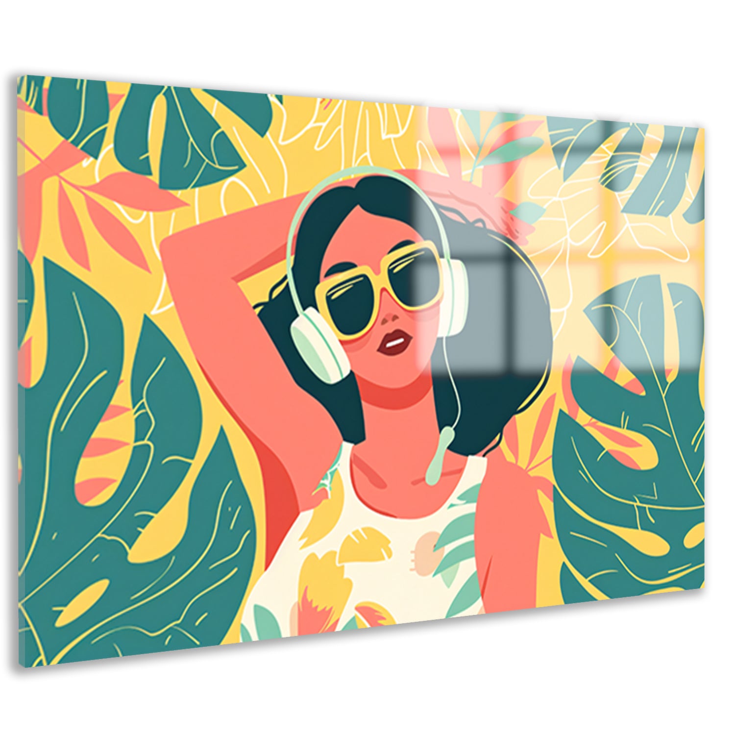 Kleurrijke vrouw met koptelefoon in relaxmodus acrylglas