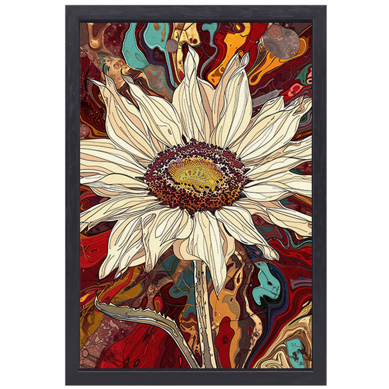 Kleurrijke zonnebloem met psychedelische achtergrond canvas met baklijst
